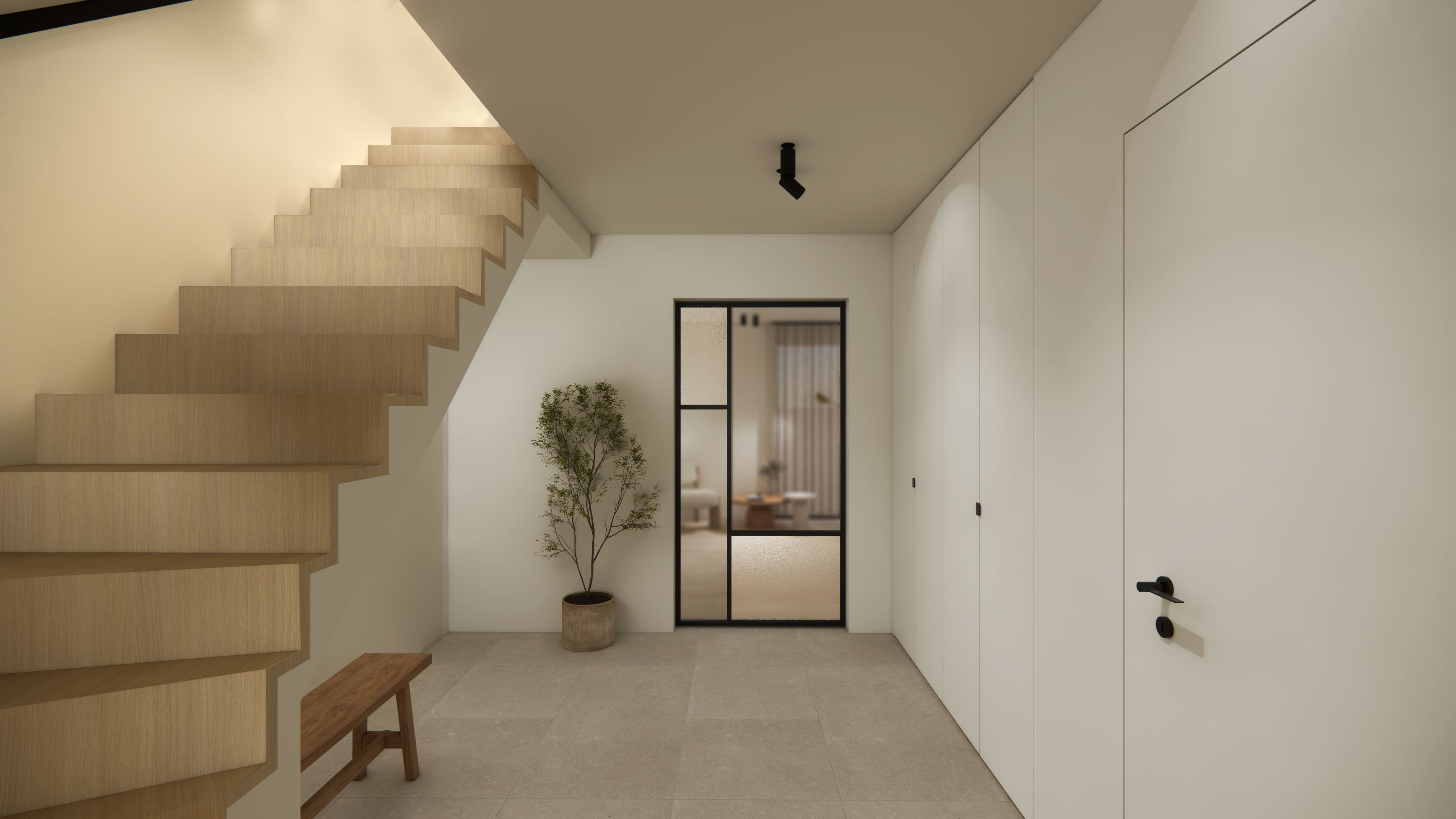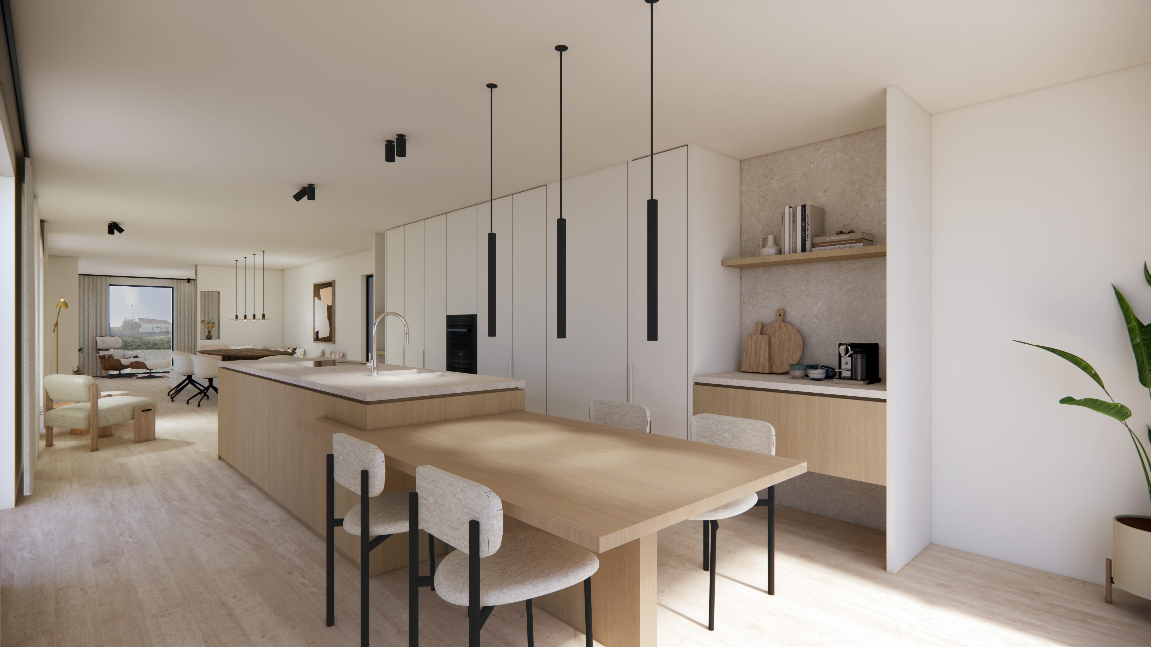 In dit nieuwe project werden de looplijnen zorgvuldig herbekeken om een vloeiende en logische circulatie doorheen de woning te creëren. De ruimtes baden in natuurlijk licht dankzij de strategische plaatsing van openingen en het gebruik van lichte, zachte materialen. Het interieur krijgt extra karakter door subtiele zwarte accenten, die voor een strak en tijdloos contrast zorgen. Het resultaat is een harmonieuze leefomgeving waar functionaliteit en esthetiek hand in hand gaan.